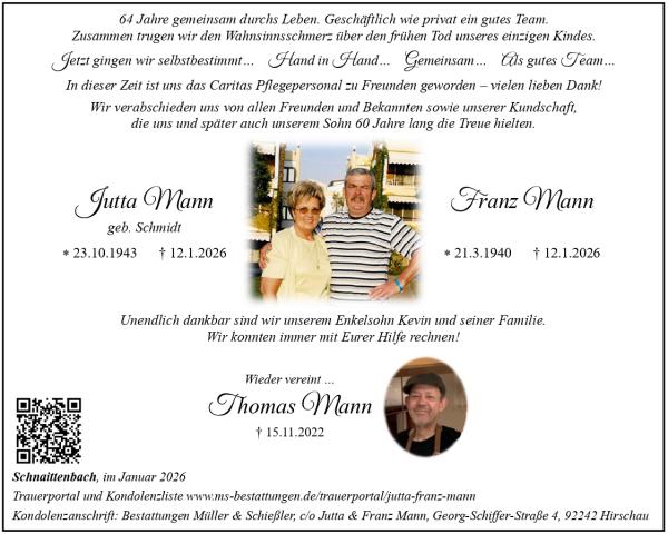 auch wenn euer Abschied selbstbestimmt war, bleibt die Traurigkeit über den Verlust zweier Menschen. Möge euch die Gewissheit begleiten, dass Ihr nach eigenen Vorstellungen gehen konntet und wieder mit eurem Sohn Thomas vereint seid.